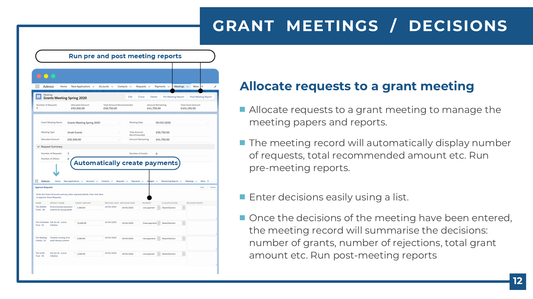 Enter grant decisions from a simple list. Option to automatically create payments.
