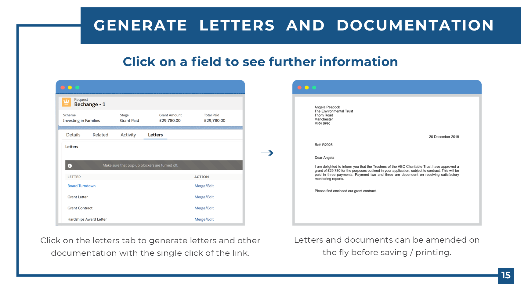 Generate an email or letter with a single click and edit before sending or printing.
