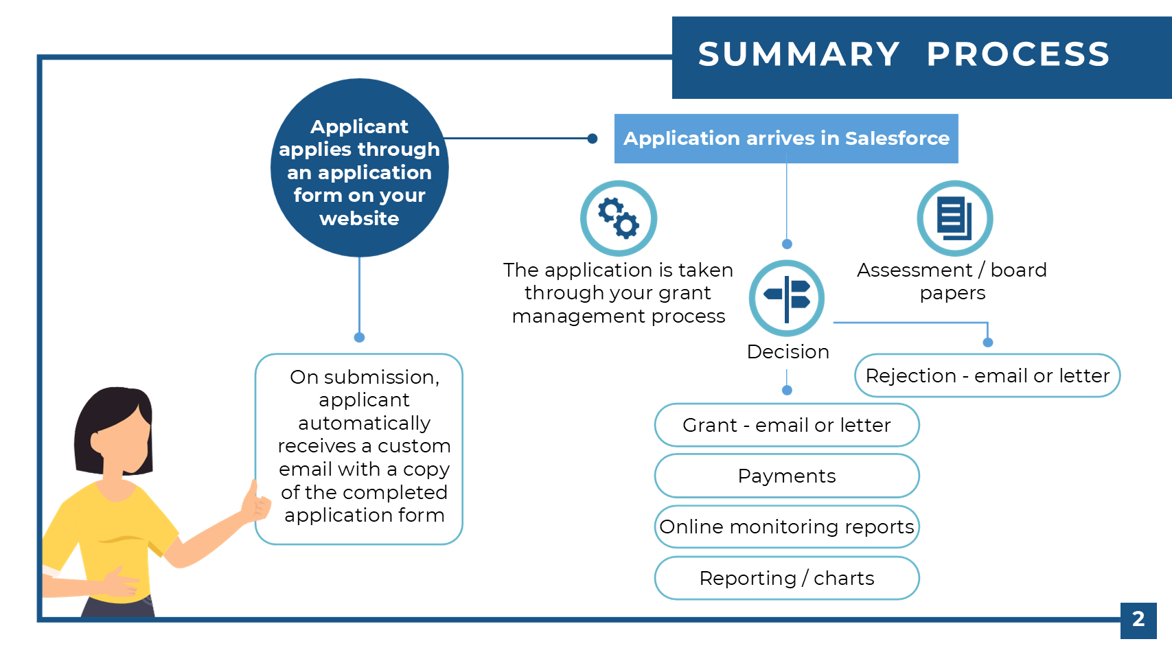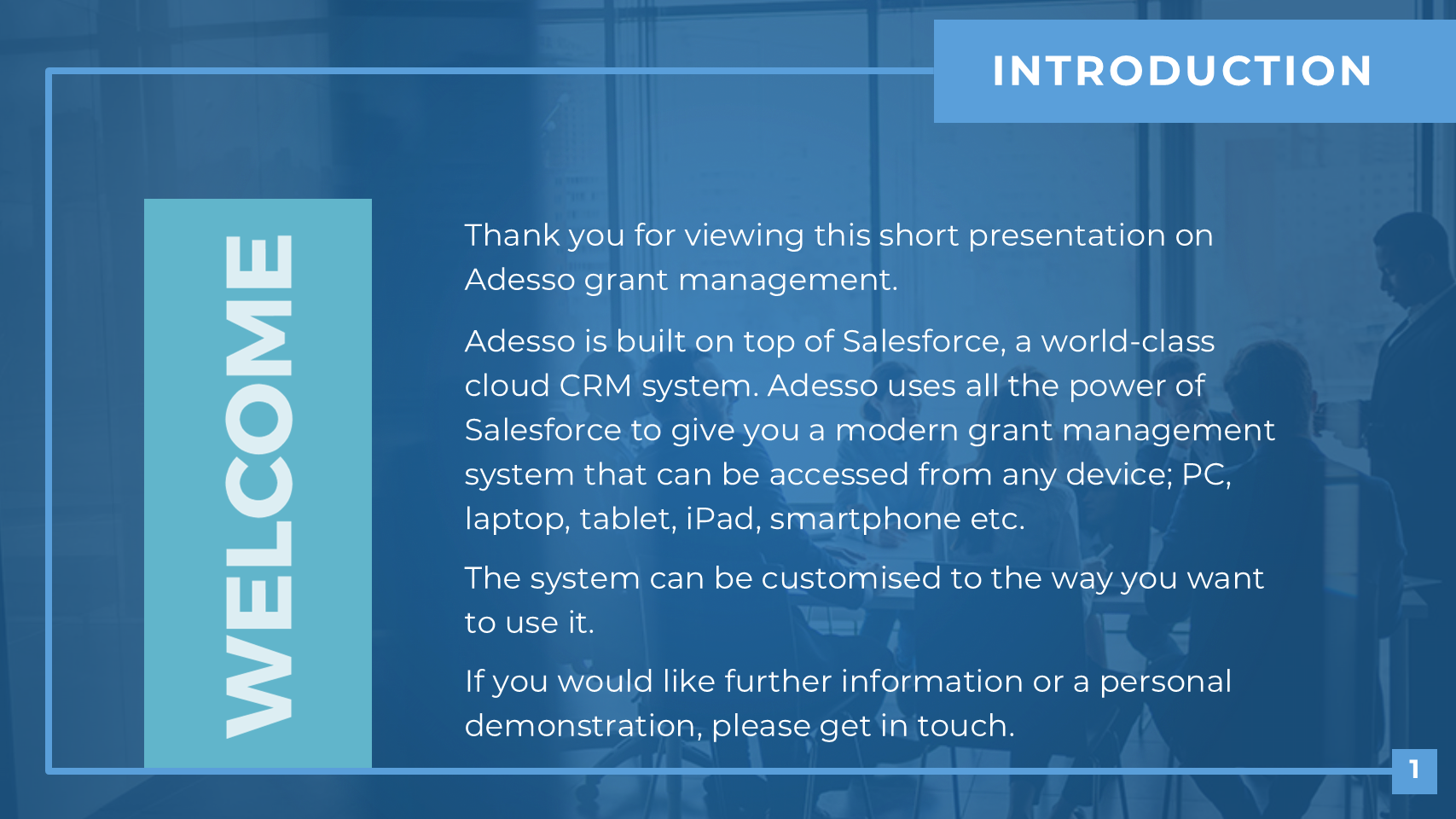 Adesso is a Salesforce application that will help you streamline your grant management. By installing Adesso, Salesforce becomes a leading-edge grant management system which can be customised to your requirements.